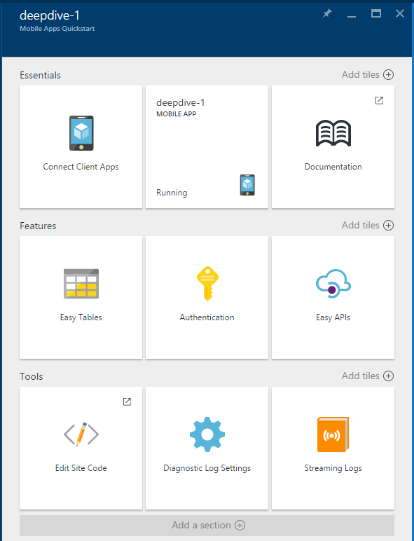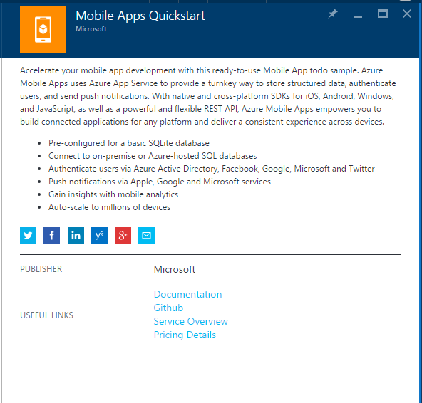 The Mobile Apps Quickstart is a pre-configured mobile backend suitable for development purposes and learning about mobile backends. It provides a base mobile backend using a SQLite database for data storage. This means that you can immediately start using it without hooking up an external database. You can still access features like Easy Tables and Easy APIs, hook up authentication and push notifications - in fact, anything that does not rely on a SQL Azure instance.