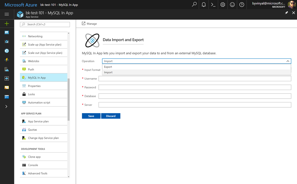 Go to your web app Settings->Feature -> MySQL in-app to access the management settings for this feature.- Import Feature in Azure portal : Select MySQL in App setting , under Data Import and Export select "Import" to import a remote database into MySQL In App database . Enter the remote database connection information to import the database. Note that MySQL In App uses MySQL 5.7.9 version and make sure your remote database is compatible with this version of MySQL .