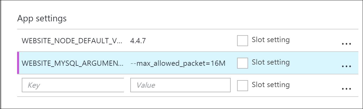 Click on your web app -> application setting , under app settings add the Key/Value pair , for example to increase max allowed packet to 16MB WEBSITE_MYSQL_ARGUMENTS = --max_allowed_packet=16M