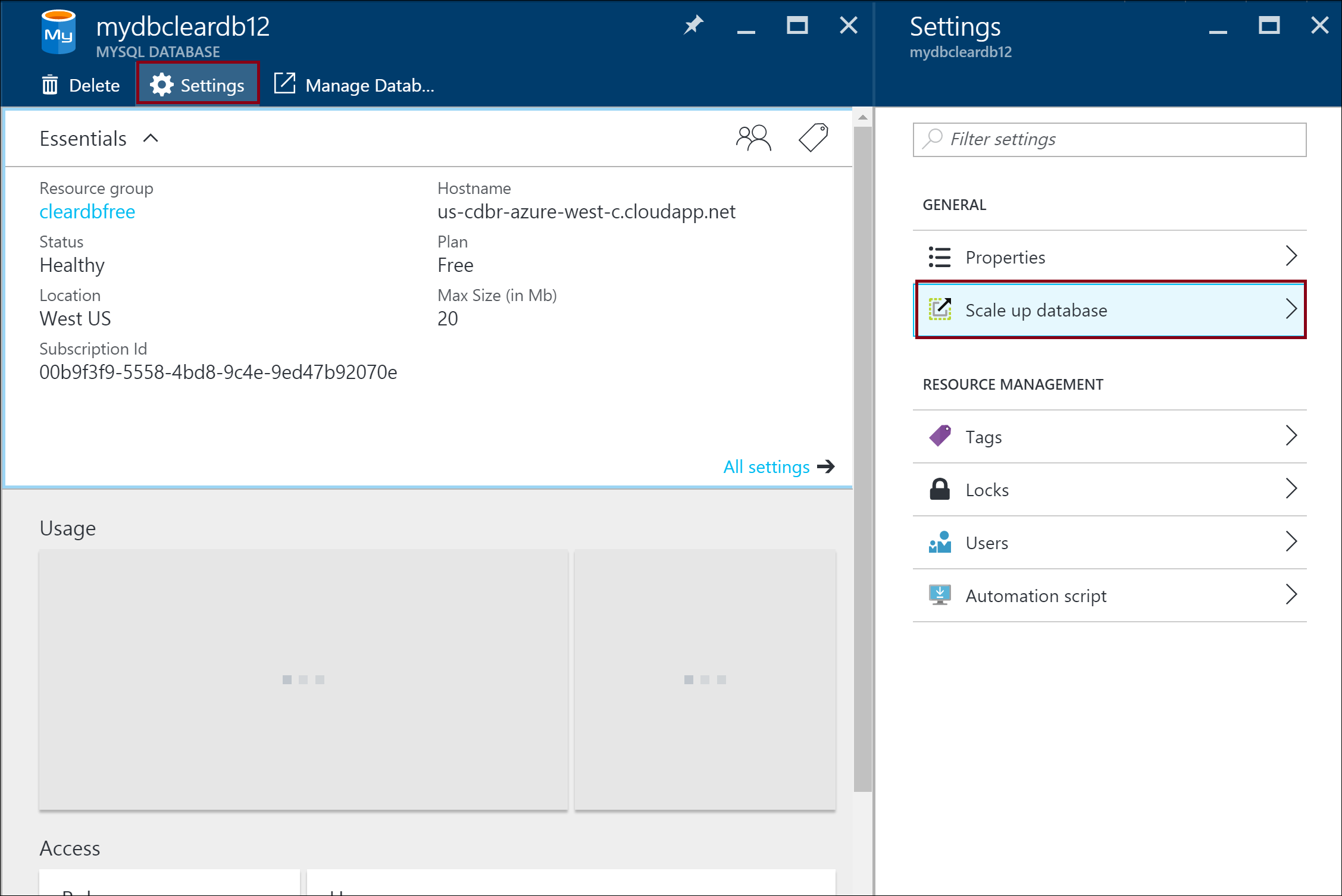 Azure portal. If you using a ClearDB database you may at some point in time hit quota limitations on ClearDB such as max connections or storage limits . For more details in pricing tiers and quota limits click
