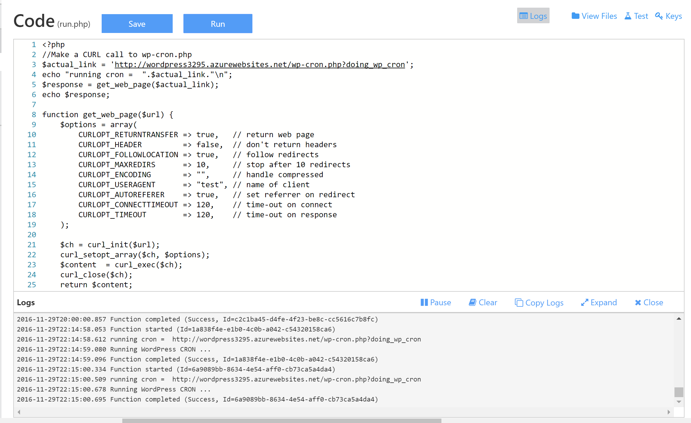 - run.php : This script just make a HTTP call using PHP CURL and gets a response . Click here to view the script. The logs will display the information of function starting , completing and the response received from the CURL call to wp-cron.php. In this example with the sample function app return a message "Running WordPress CRON .."