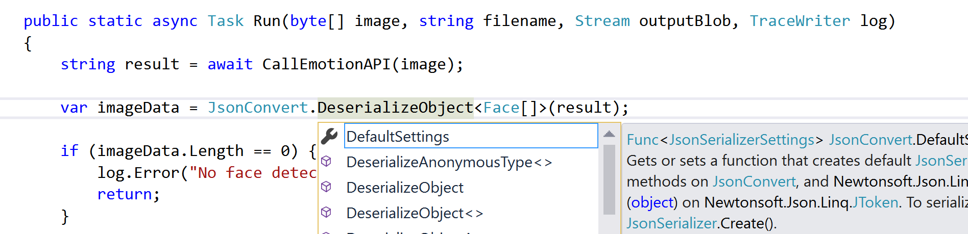 Update #1: The Azure Functions CLI has been renamed to Azure Functions Core Tools. Update #2: We now have Visual Studio 2017 tooling for Azure Functions! You can use WebJobs attributes to configure triggers and bindings, so there is no need to manually author function.json. For more information, see the following: With our new Azure Functions runtime support for precompiled functions, you can now use familiar Visual Studio features such IntelliSense and unit testing. These features were among the top requests after we launched the preview Visual Studio Tools for Azure Functions. This also enables an improved development workflow for customers who feel that that class libraries are a better fit for their application. Azure Functions now supports publishing a class library as the implementation for one or more functions in a Function App. We’ve also recently made several runtime improvements to make assemblies much more useful, such as shadow-copying managed assemblies to avoid file locking issues and restarting the Functions runtime to pick up newly deployed binaries. Using Visual Studio 2015 or 2017, you can try precompiled functions today with a few manual tweaks to your project. The manual steps are needed because the existing Functions project type (.funproj) has no build action, since it contains only script files. With the setup below, you'll instead use a web project which will provide the full development experience of IntelliSense, local debugging, and publishing to Azure. The next version of Visual Studio tooling for Azure Functions won’t require this manual configuration, as it will be directly based on class libraries. In fact, the Visual Studio experience will be optimized around class libraries, while the Functions portal will continue to use script files. intellisense-cropped