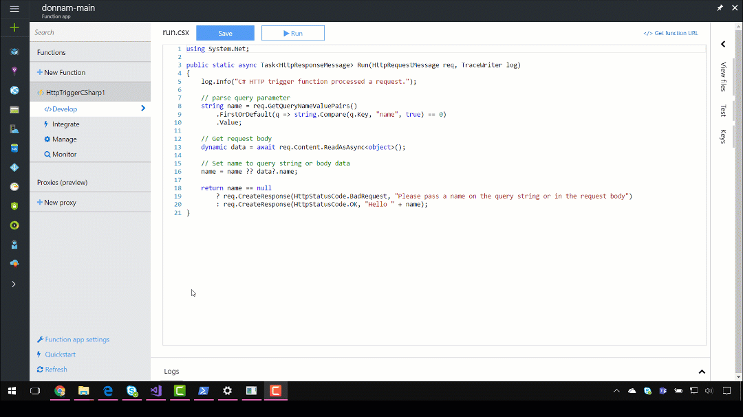 There’s another big advantage to using a web project—continuous integration with build on the server just works! Just follow the same steps as continuous deployment for Azure Functions. Your project will be built whenever there is a sync from source control. This will only work if you’re using a Web Application project, but not if you’re using a Functions Project (.funproj). To see this in action, just fork the HttpTrigger sample project and set up GitHub as your continuous integration source.