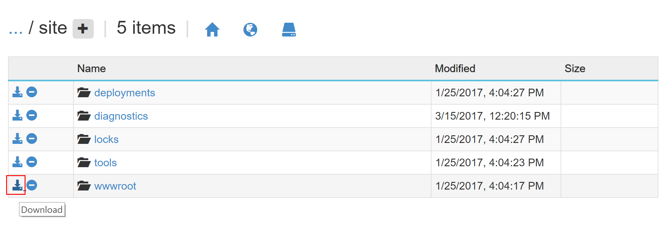 This will create a local file called appsettings.json. These settings are only used locally by the Functions Core Tools. Since this file contains secrets, be sure not to check this file in to source control! (The Azure Functions Core Tools adds appsettings.json to .gitignore for you.) Animated gif: kudu-download kudu