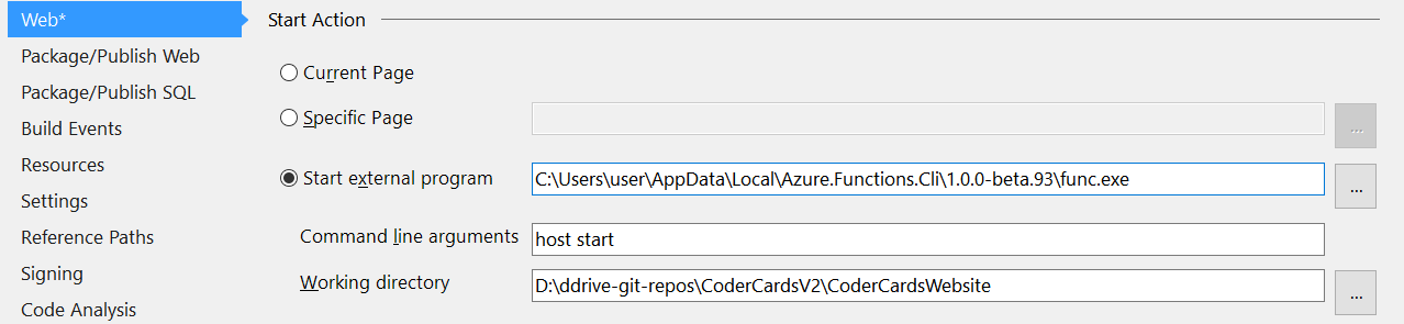 • OR, if you've installed the Visual Studio Functions Tooling, the path will look something like C:\Users\USERNAME\AppData\Local\Azure.Functions.Cli\1.0.0-beta.93\func.exe