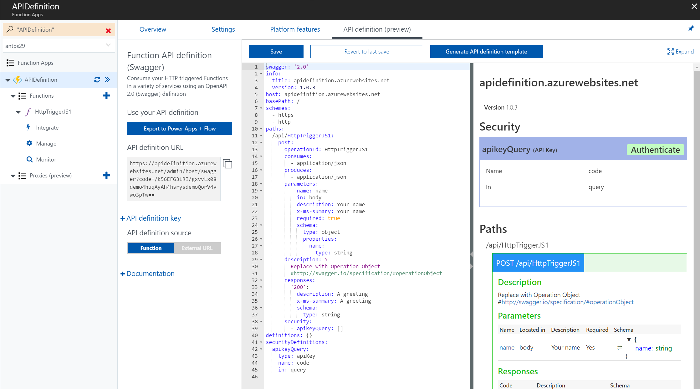- To create your first OpenAPI (Swagger) definition you must first have a function App with at least one HTTP Trigger Function. Instructions.