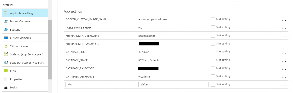 You can find the credentials for PHPmyadmin in the Azure portal . Select your web app , then select Application Settings -> App settings
