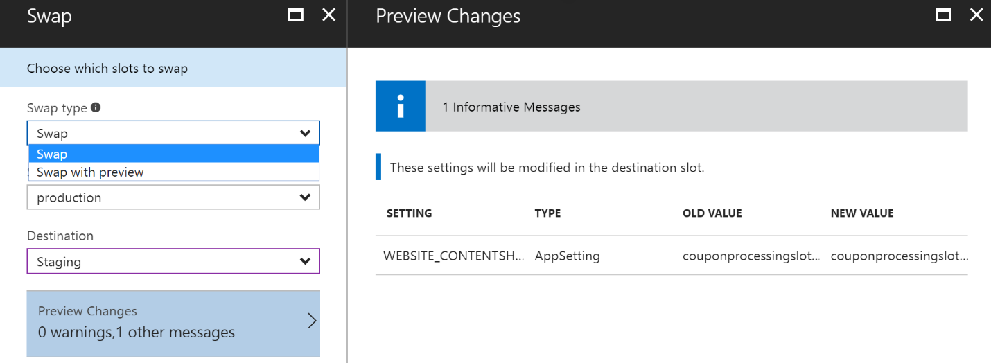 You can select the swap type as direct swap or a swap with preview where destination slot configuration is applied to the source deployment slot to allow validation before the swap is finalized. You can also see a configuration diff to make sure you are aware and can react to how configuration elements are impacted by the swap action.