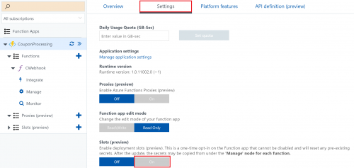 After preview opt-in the Function App secrets will be updated. Please copy the new secrets under the