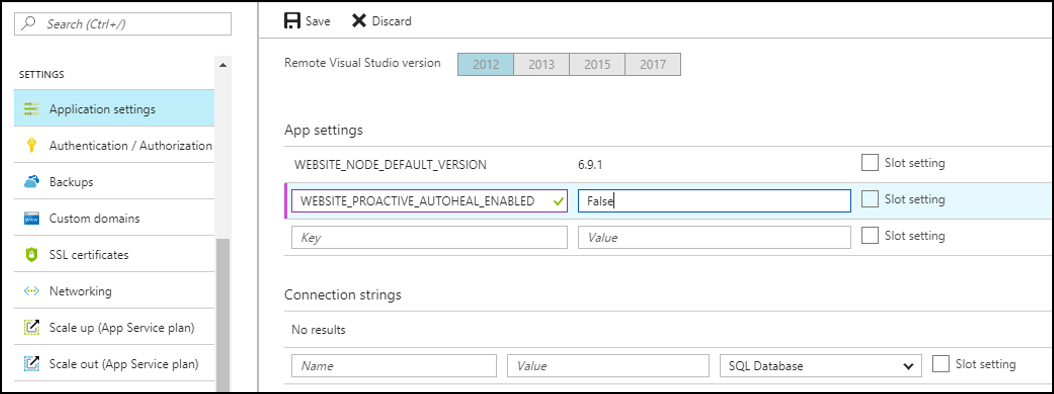 - Under App Settings add “WEBSITE_PROACTIVE_AUTOHEAL_ENABLED” and set it to “False.”