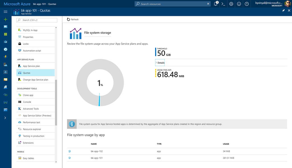 per app file system usage breakdown. This UI is available for both App and App Service plans and can be found in the menu under