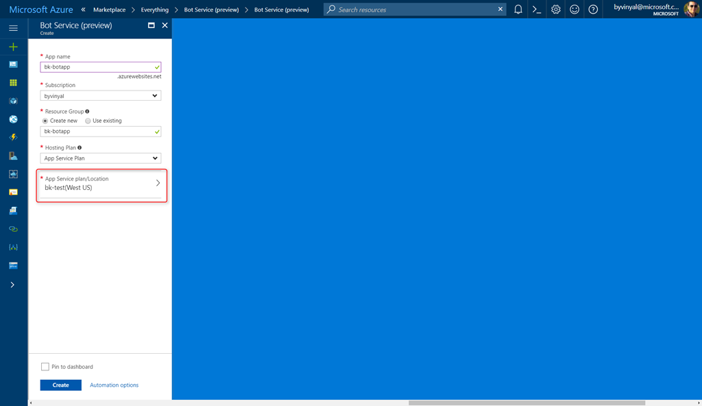 choose an App Service plan for a bot in Azure Bot Service.