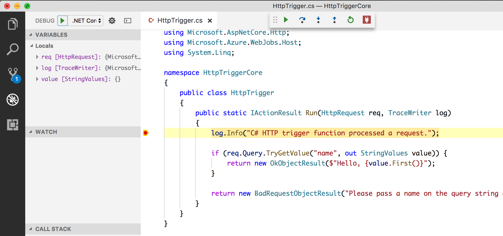 http://localhost:7071/api/HttpTriggerCSharp?name=CSharpEverywhere!. You’ll then see your breakpoint hit in VSCode.