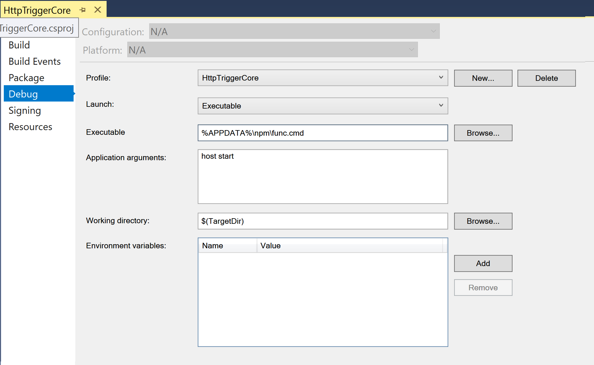 Then, add a new launch configuration for the 2.0 version of the Core Tools: