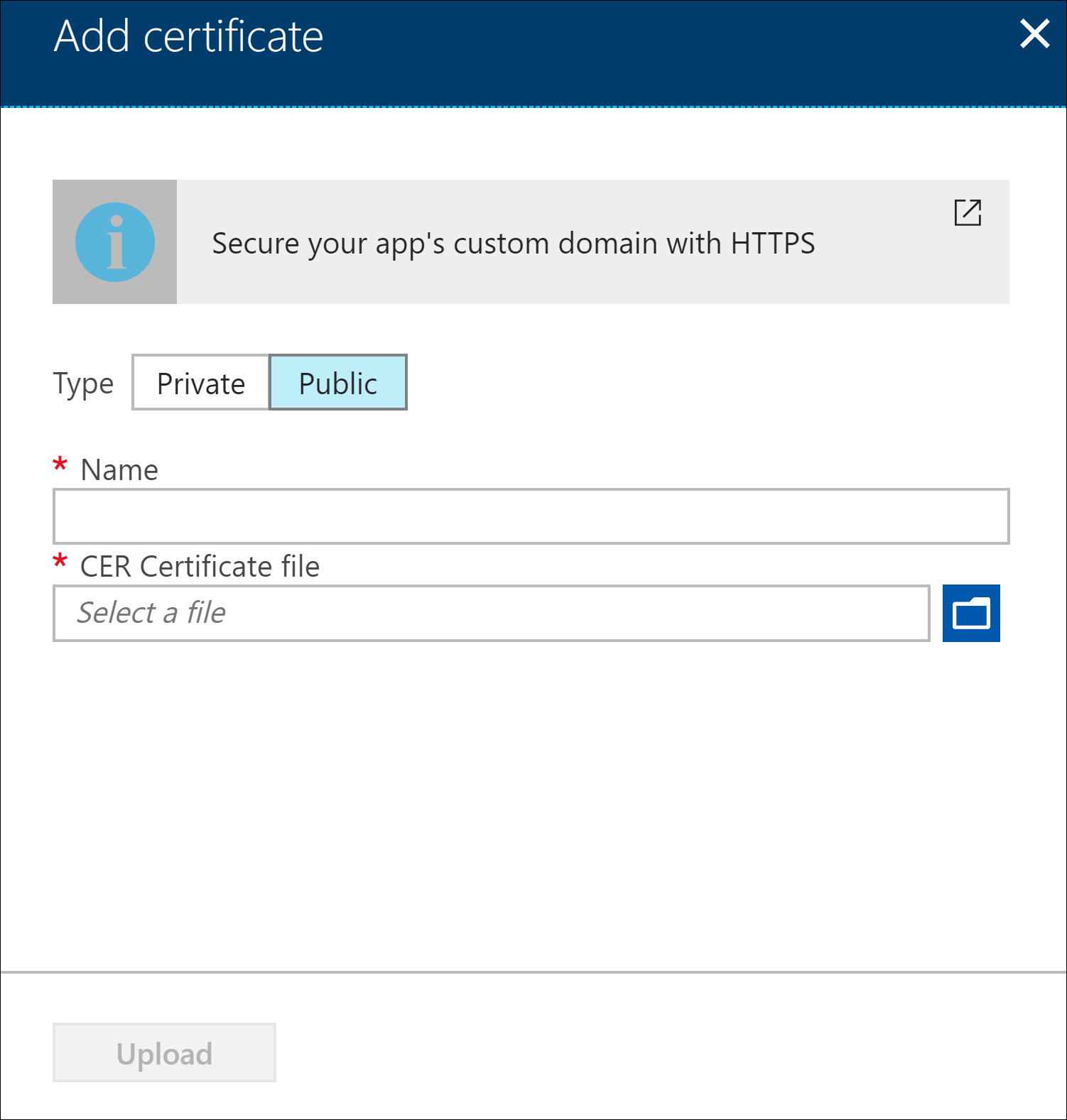 ublic Certificate for your App service web app using the Azure Portal. Follow the steps below to upload a public certificate :