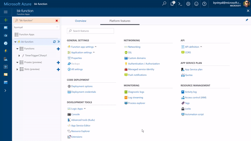 Functions and Logic apps work great together and are often developed side by side. We’ve made it easier to move from Functions to Logic apps by including it in the platform features for functions. This will open an new tab where you can quickly switch between resources.