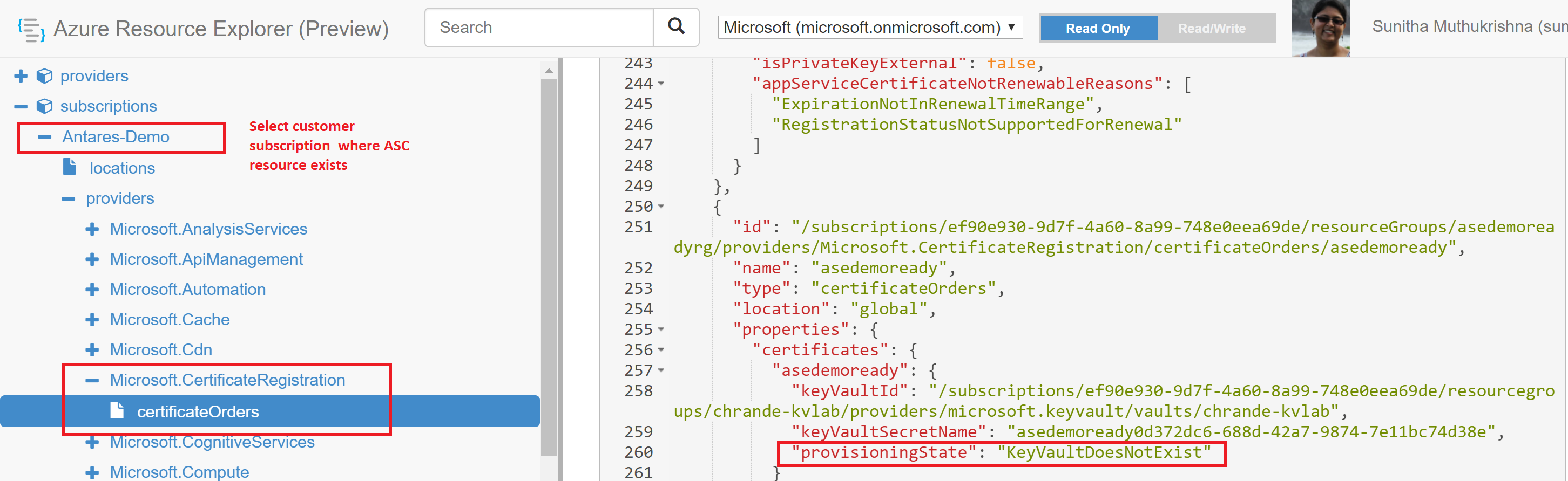 - Debug using Resource Explorer : You can look at the certificate order state in resource explorer https://resources.azure.com . Select your subscription -> Providers -> Microsoft.CertificateRegistration->Certificateorders . This lists all the certificate orders within the subscription.