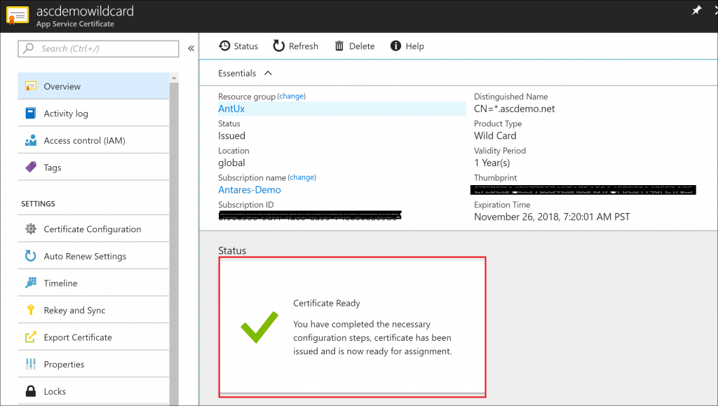 - Verify Status of your Certificate : Check if the Status of your certificate is ready for use. Sometimes the certificate might have Domain verification step pending and this status tile can help provide information on what steps you need to take