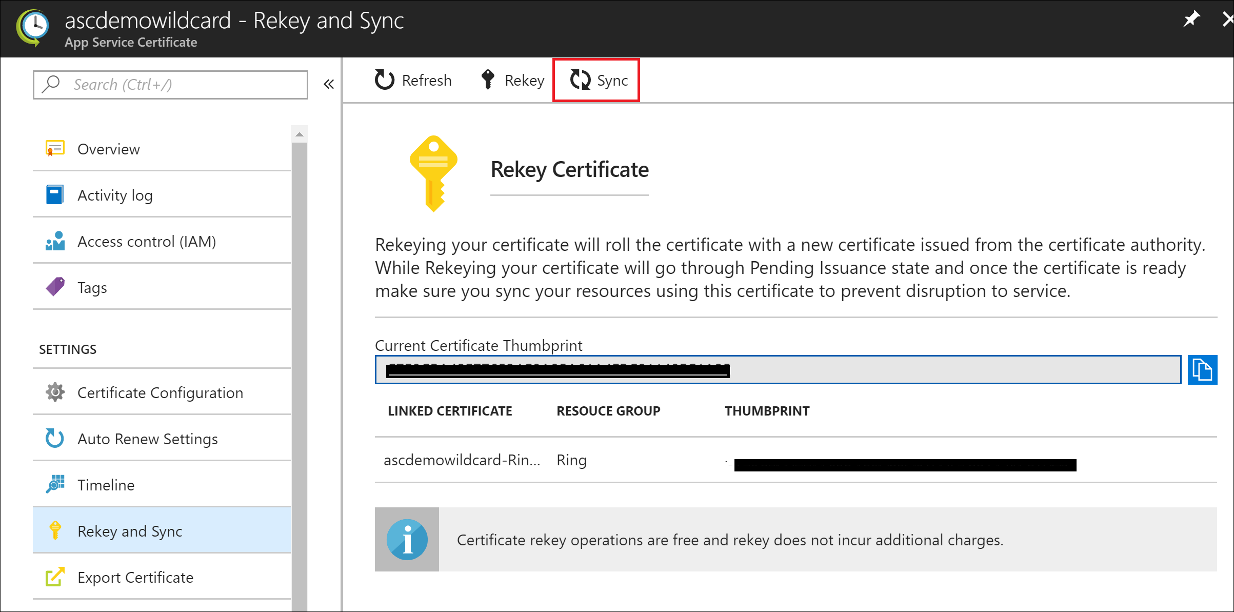 - Sync a Certificate : The Web App service runs a background job that periodically (once a day ) that syncs all App Service certificate. Hence when you rotate or update a certificate, sometimes the application is still retrieving the old certificate and not the newly updated certificate. This is because the job has not run to sync the certificate resource. To force a sync of the certificate , you can click on Rekey and Sync setting and then click on Sync button .