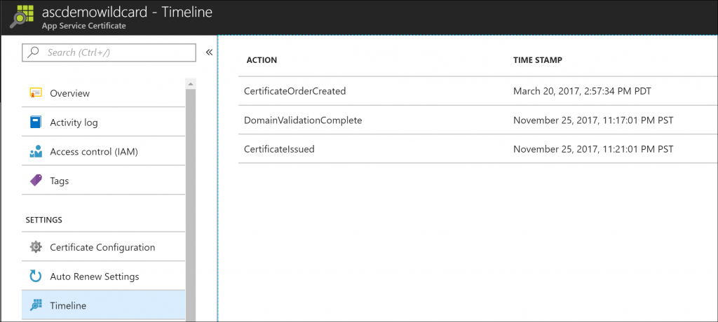 - Debug using Timeline : View the list of historical activities or operations that have occurred on App Service Certificate resource using the Timeline feature to help debug the issue