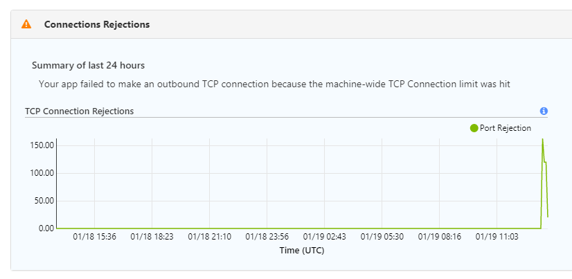 Check if there are any port rejections. If your web app failed to make an outbound TCP connection because the machine-wide TCP Connection limit was hit, we will highlight that in the Summary and associated graph.