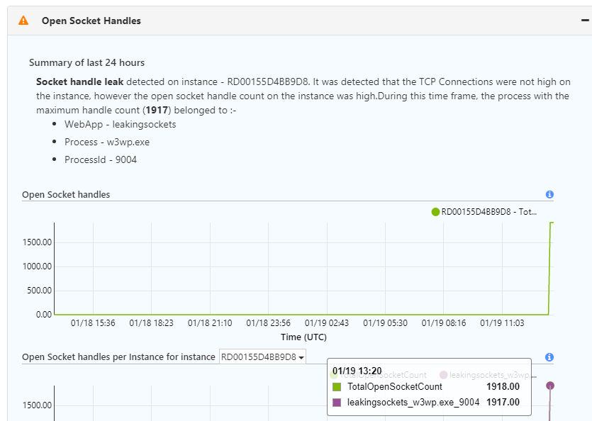 If your web app has leaking connections, you will see the process name, process ID, site name, and number of open handles. We will highlight the process that is causing the maximum damage in the Summary.
