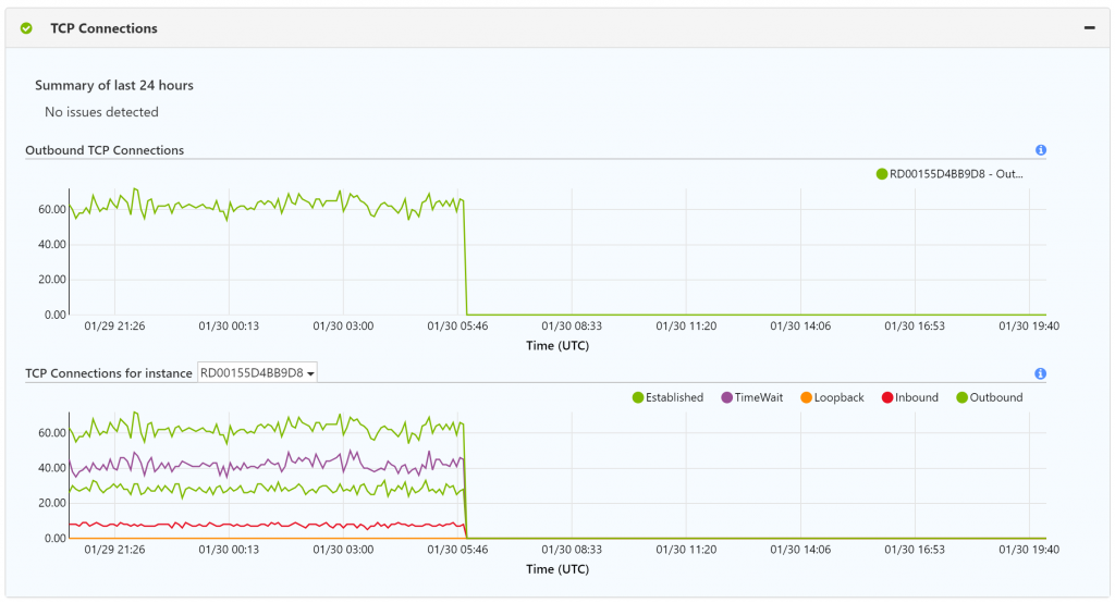 Upon opening the TCP Connections, you can quickly see three levels of data: TCP Connections, Connections Rejections, Open Socket Handles. If it’s healthy, there will be a green checkmark. If it’s unhealthy, there will be an orange exclamation mark.