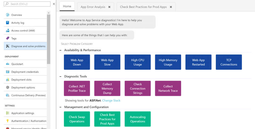App Service Diagnostics, an intelligent and guided troubleshooting experience that points you and the right direction to diagnose and solve issues of your web app (without having to configuring anything special to enable this feature!). Since then, we’ve read all the feedback that you all have given, and have added new capabilities to make this feature even more robust and insightful, all without you have to configure anything special.