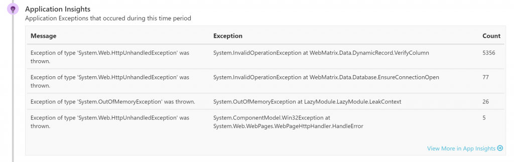 common exceptions that your app is throwing and dependencies that are causing issues under Web App Down and Web App Slow. These are all correlated to the downtimes that you’ve selected via the orange bar. Hopefully, you’ll be able to recognize your application code issues from the commonly occurring exceptions, but if not, we deep link into Application Insights for more context.