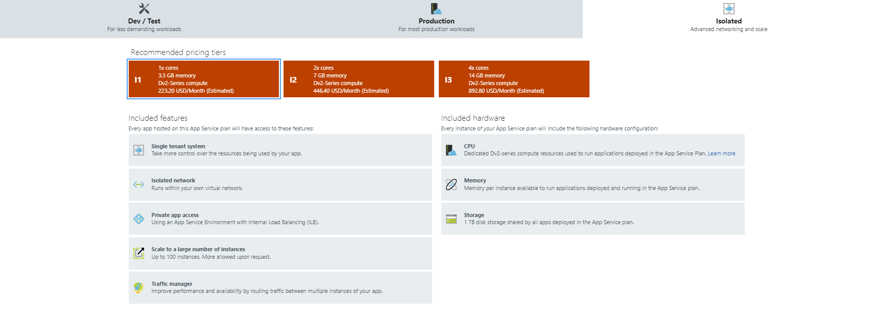 When creating a new App Service Plan, remember to select one of the Isolated SKUs.
