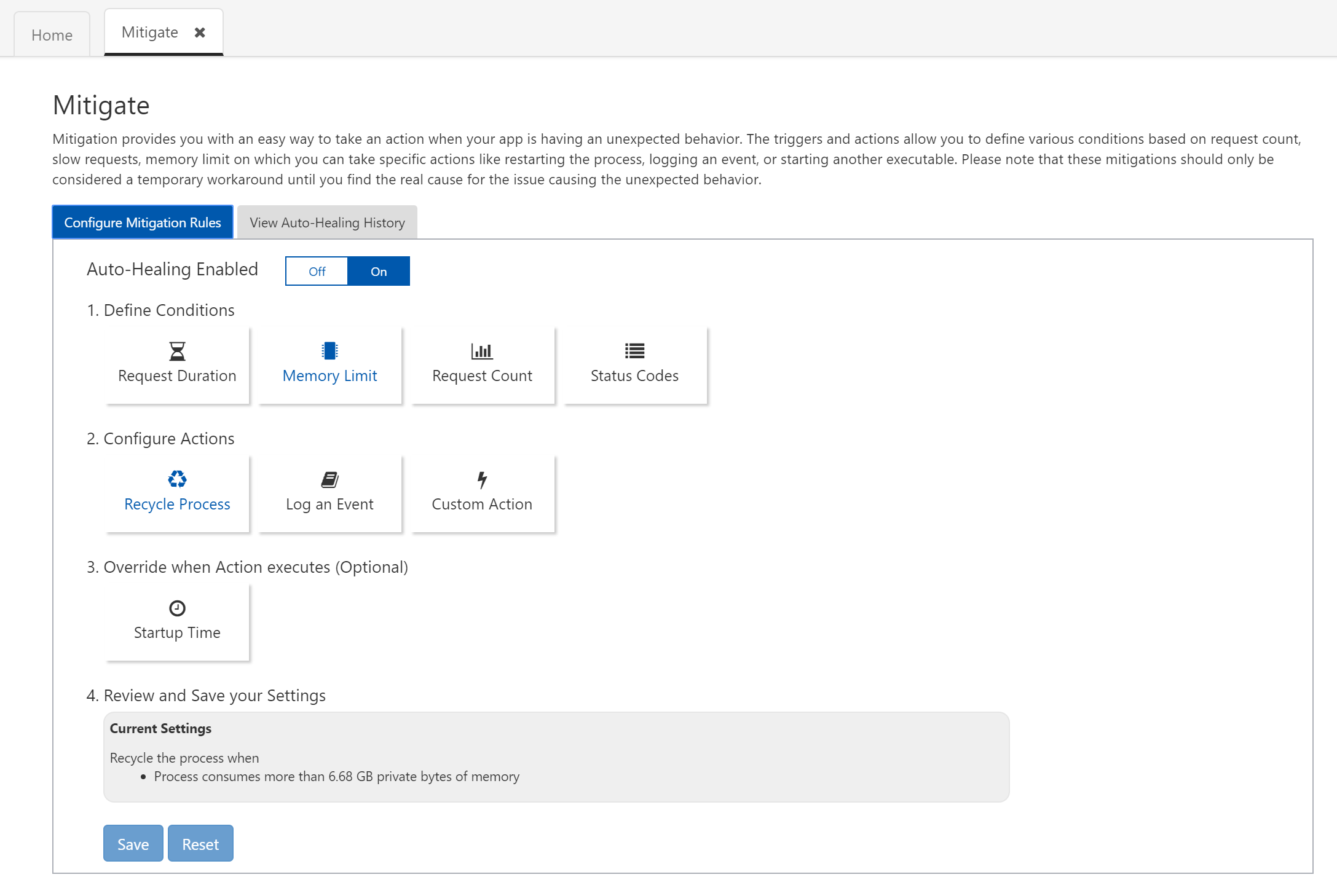 Get ahead of your issues and automatically mitigate these unexpected behaviors by trying out Mitigate and Auto Heal in App Service Diagnostics.