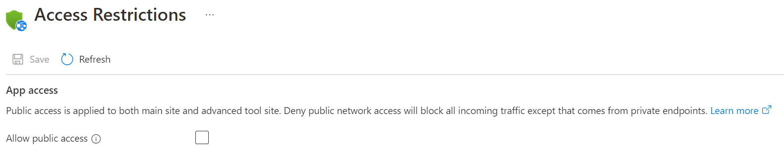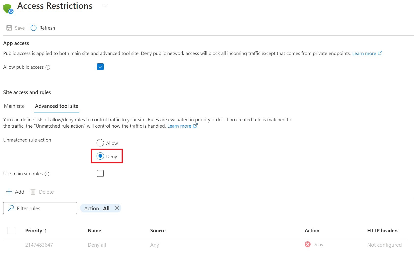 Earlier on when you were creating the web apps, you disabled basic authentication to the WebDeploy port and SCM site. You’ll want to also disable all public access to the SCM site. This has already been done for the backend web app when you added the private endpoint. You will only need to do this for the frontend web app. Doing this, however, limits how code can be deployed to your app. Later on, we’ll walk through how to give a service principal access to deploy your source code. To disable public access, navigate to the Access restriction (preview) page for your frontend web app and select the Advanced tool site tab. For the Unmatched rule action, select “Deny”, then Save, and Continue. You can’t deny all public access using the checkbox at the top because that will deny public access to your frontend’s main site as well. Doing this would prevent your users from being able to access your frontend which is not what we want.
