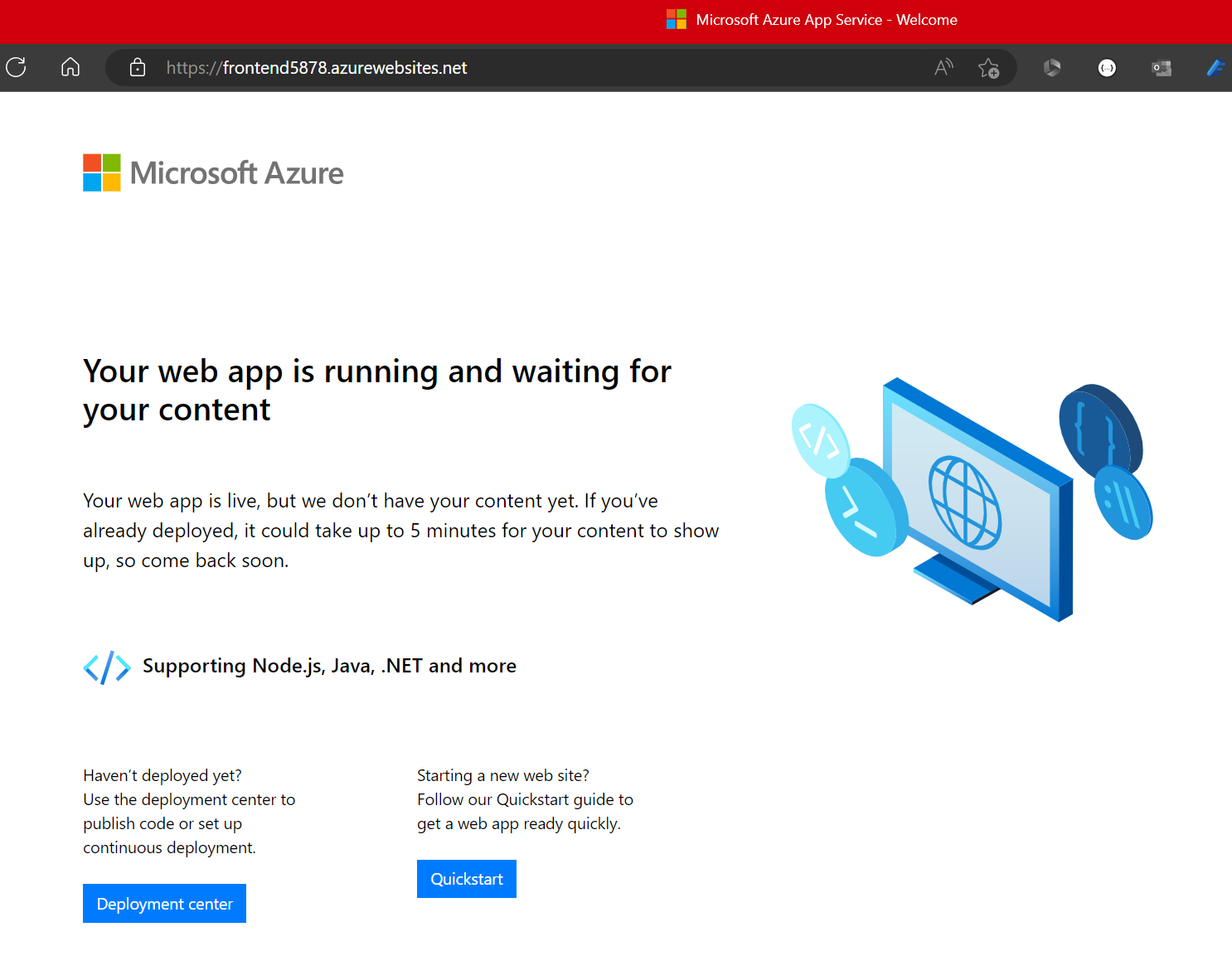 Try navigating to your frontend’s endpoint. You should see content similar to what is shown below. This means your frontend is publicly accessible and ready for your source code as intended. Try navigating to your frontend’s SCM site as well and confirm that access is denied.