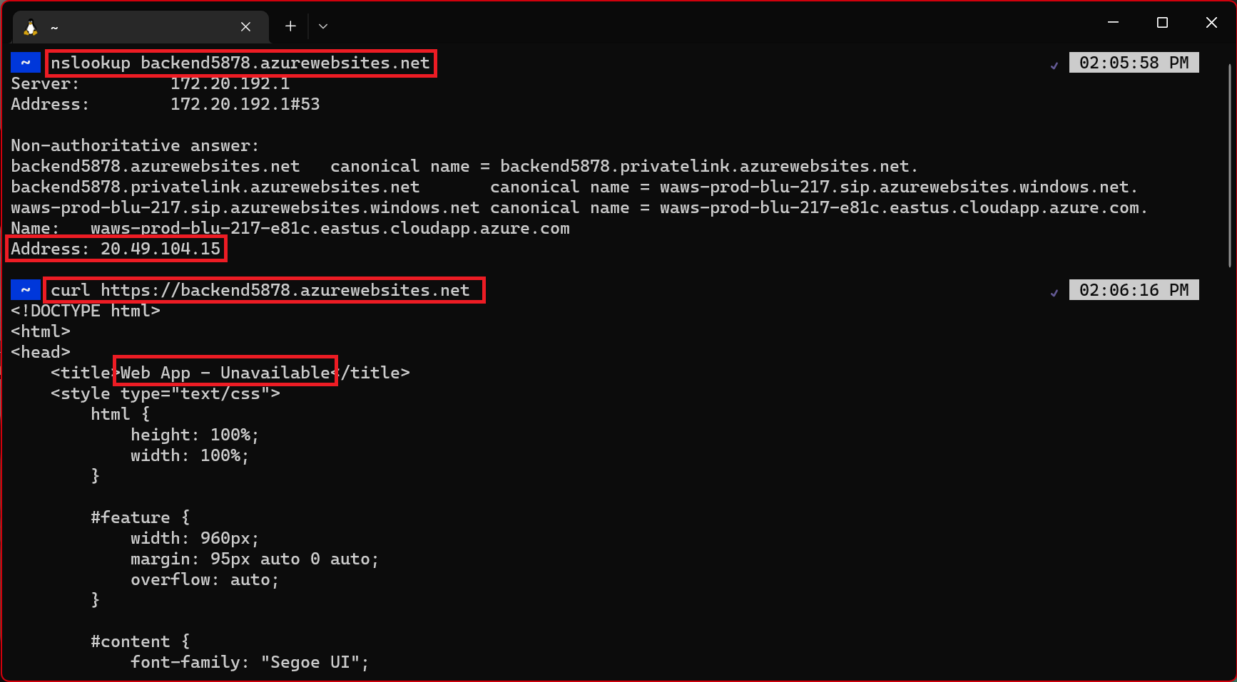 Repeat the same nslookup and curl commands from another terminal (one that is not an SSH session from your frontend’s instances). The nslookup will return the public IP for the backend web app. Since we blocked public access to the backend web app, if you try to reach the public IP, you will get an access denied error which means this site will not be accessible from the public internet, which is what we want. The nslookup doesn’t resolve the private IP because that can only be reached from within the virtual network using the private endpoint and only the frontend web app is within the virtual network. If you try to do a curl on the backend from an external terminal, you’ll see the HTML returns “Web App - Unavailable”, which is the HTML for the error page you saw earlier when you tried navigating to the backend in your browser.
