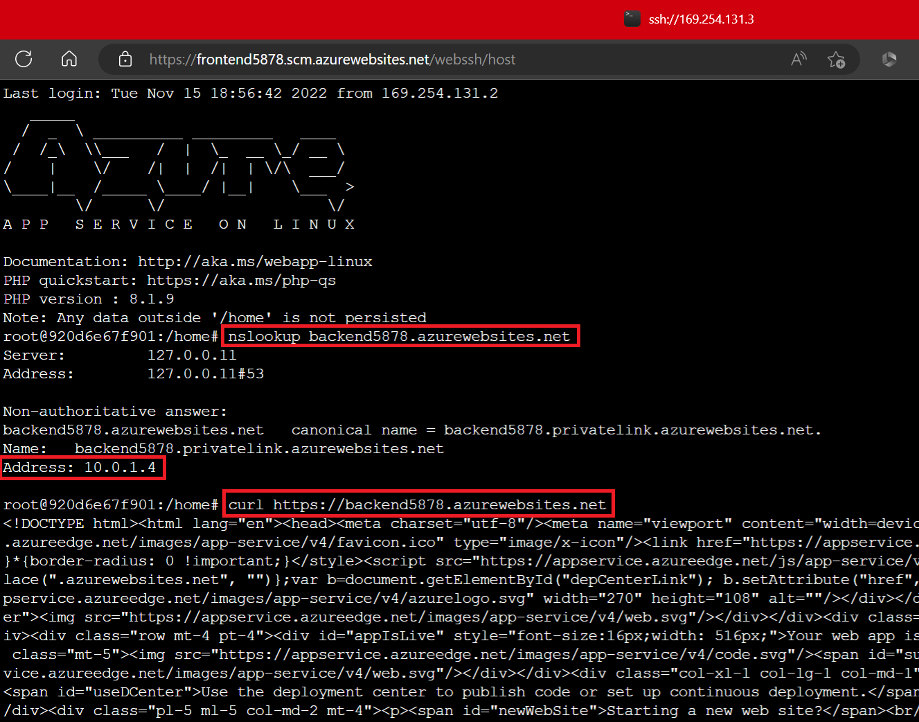 Navigate to the SCM site for your frontend by going to https://frontend-web-app-name.scm.azurewebsites.net/. If you can’t access it, make sure you’ve added the rule for your IP as shown above. Select SSH from the menu bar at the top. Doing this creates an SSH session on your frontend’s instances. Once that loads, you’re going to do an “nslookup” on your backend to confirm that it can be reached from the frontend using the private endpoint. Type “nslookup backend-web-app-name.azurewebsites.net”. Under the “Non-authoritative answer”, it should resolve the private IP address you noted earlier. You can also do a “curl” on your backend’s endpoint to display the backend’s current site contents. For now, curl will display the HTML for the empty web app.