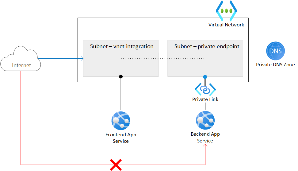 - Frontend web app. This architecture uses two web apps - a frontend that is accessible over the public internet, and a private backend web app. The frontend web app is integrated into the virtual network in the subnet with the feature regional VNet integration and it is configured to consume a DNS private zone.