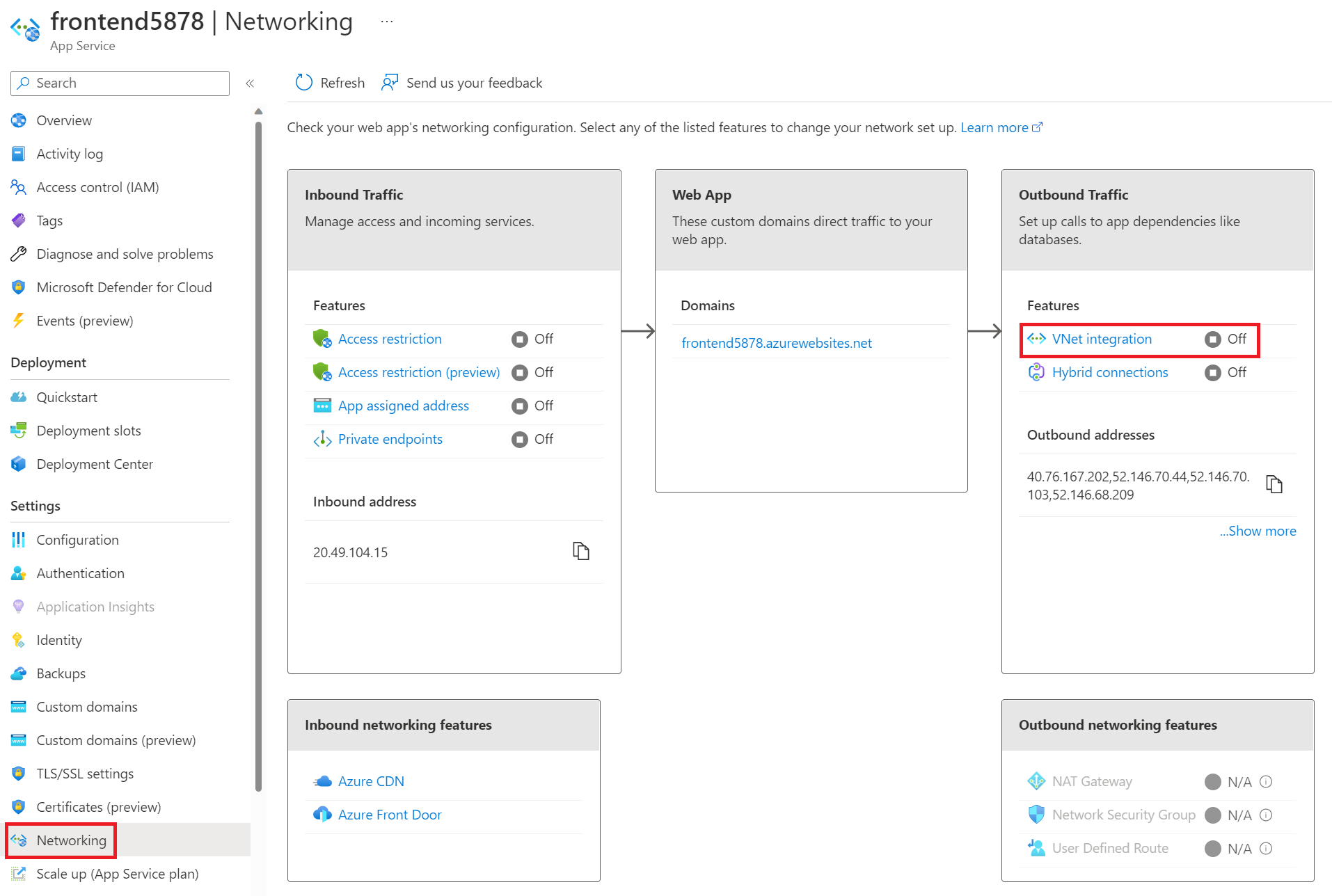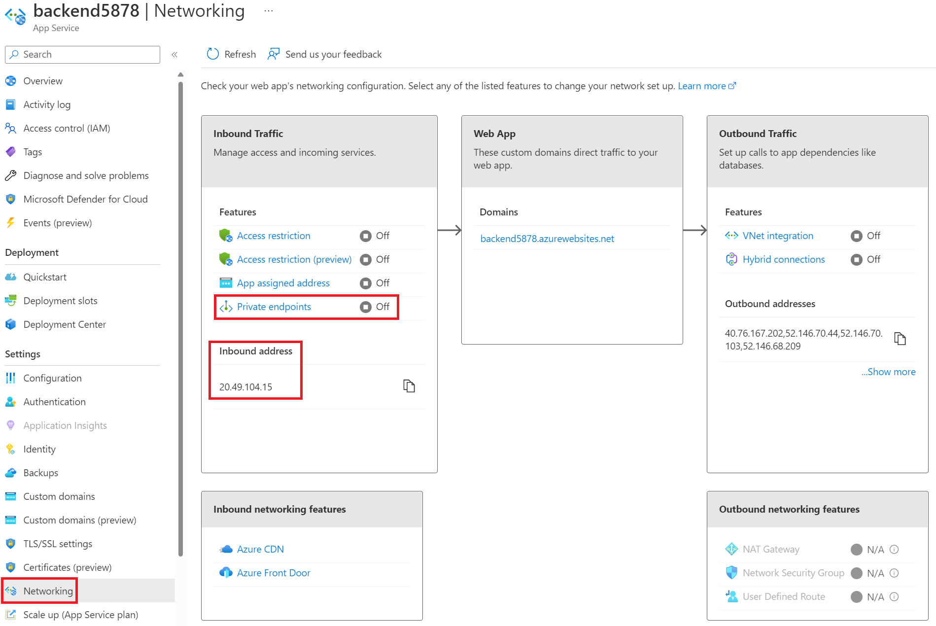 - In the Azure portal, go to your backend web app and then go to the Networking page. Under Inbound address, you’ll see the public IP that was automatically delegated to your web app. Note that when you add the private endpoint, this will change to a private IP from your Azure virtual network address space.