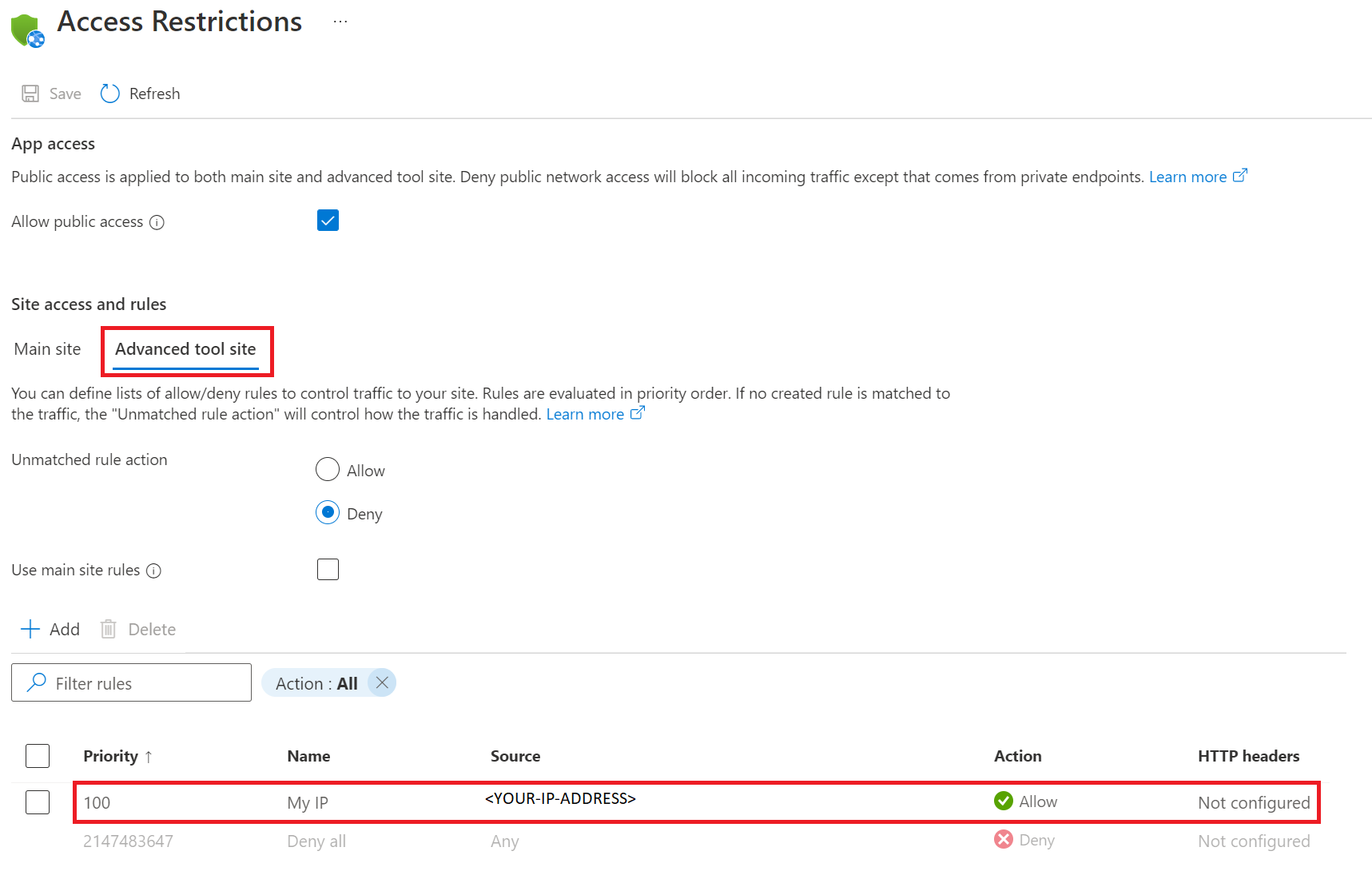 To validate the connection between the frontend and the backend, you’ll need access to the SCM site. For this, the simplest method if you’ve been following along is you can add a temporary rule to your frontend’s access restrictions that allows access from your IP. See the below screenshot for an example. For source, use your IP address.