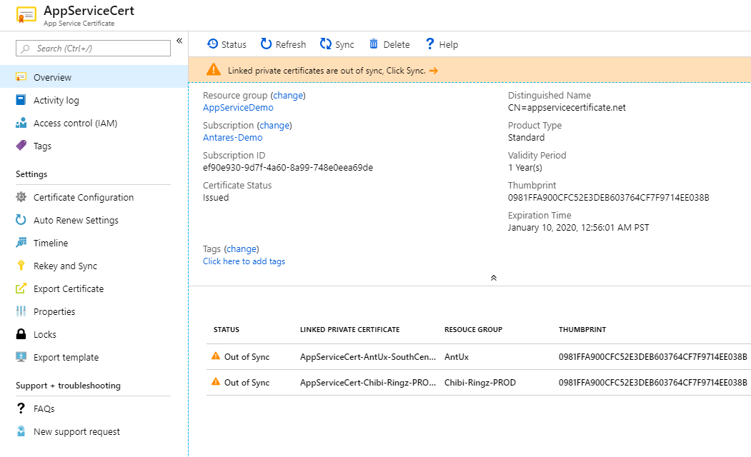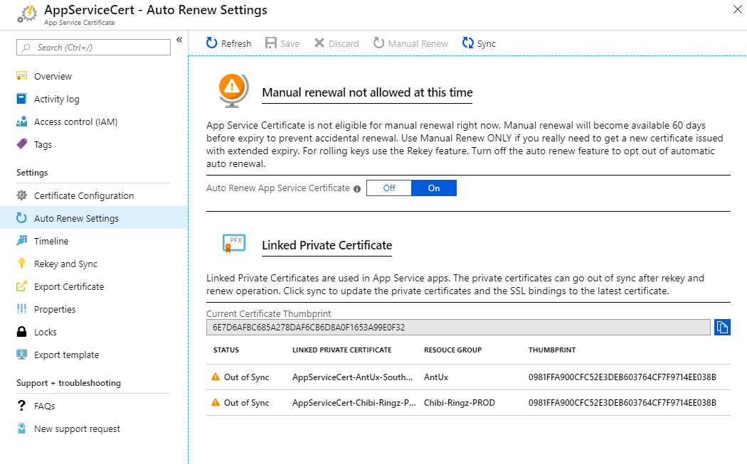 App Service Certificates have been a very popular feature among App Service customers. However, our customers often get confused about the sync scenarios between App Service Certificates and Linked Private certificates. Specifically during the Manual Renew, Manual Rekey, and Auto Renew operations. This blog will showcase recent UX improvements to give you control over the sync scenarios. We will also talk about the internals of the automatic sync tasks running in the background to keep your certificates and SSL bindings synced up automatically.